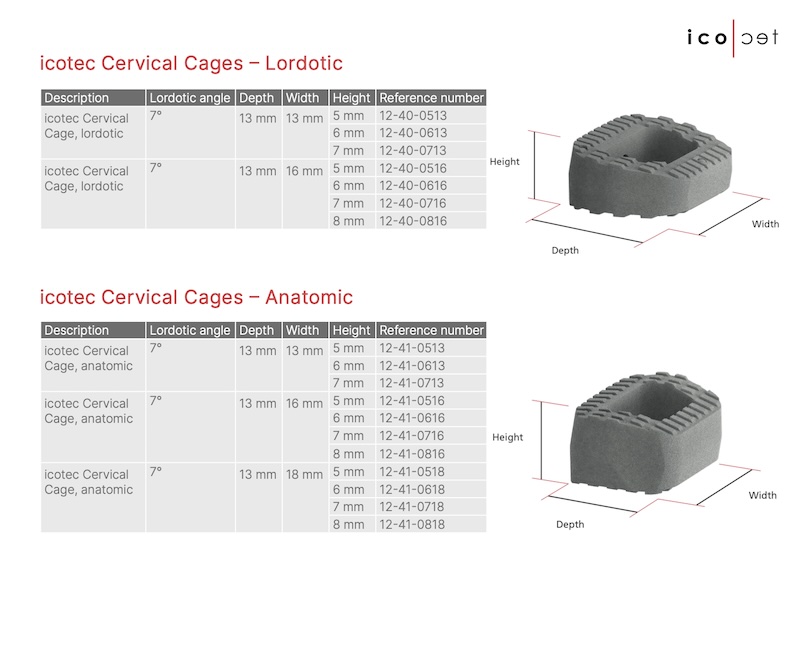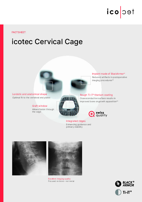 The Cervical Cage by icotec Medical is a radiolucent ACDF spacer composed of a proprietary carbon fiber/PEEK BlackArmor. The Cage is plasma sprayed titanium coating using proprietary Ti-iT coating for increased grip and bony adhesion.