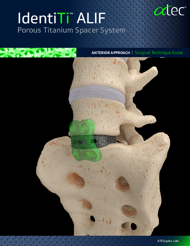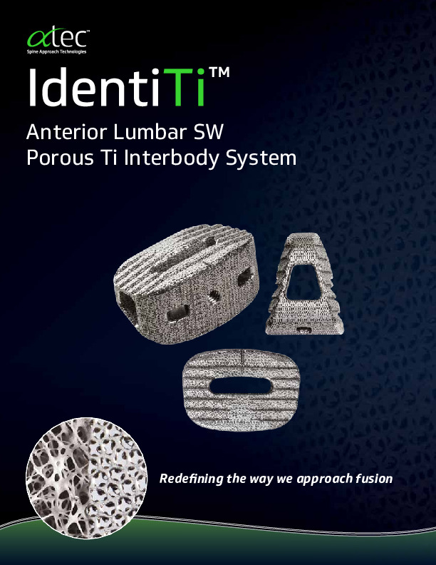 The IdenitiTi -ALIF SW & LW (Small window & Large Window) cages are 3D printed titanium Interbody spacers for use in the ALIF anterior lumbar interbody fusion procedure and intended for use in conjunction with supplemental fixation.