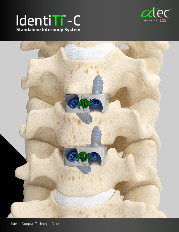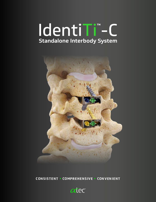 The IdentiTi -C by ATec is a 3D printed titanium 0-Profile ACDF spacer with integrated screws for added fixation and use in a standalone construct. Suitable for single and 2 level ACDF cases.
