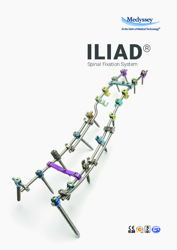 ILIAD by Medyssey is a thoracolumbar posterior spinal fixation system with a variety of screw options with heads that feature a dovetail locking system with linear slot mechanism. The dovetail thread design reduces the chance of cross threading, while the linear slot in the set screw compresses upon final tightening to increase holding forces and preventing screw back out. The screws are available in mono, poly, reduction mono, reduction poly, cannulated mono, and cannulated poly options, with a wide range of sizes. The rod options include straight, pre-bent, titanium alloy, and cobalt-chrome molybdenum alloy.