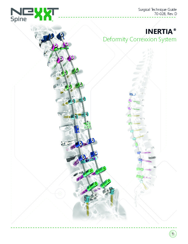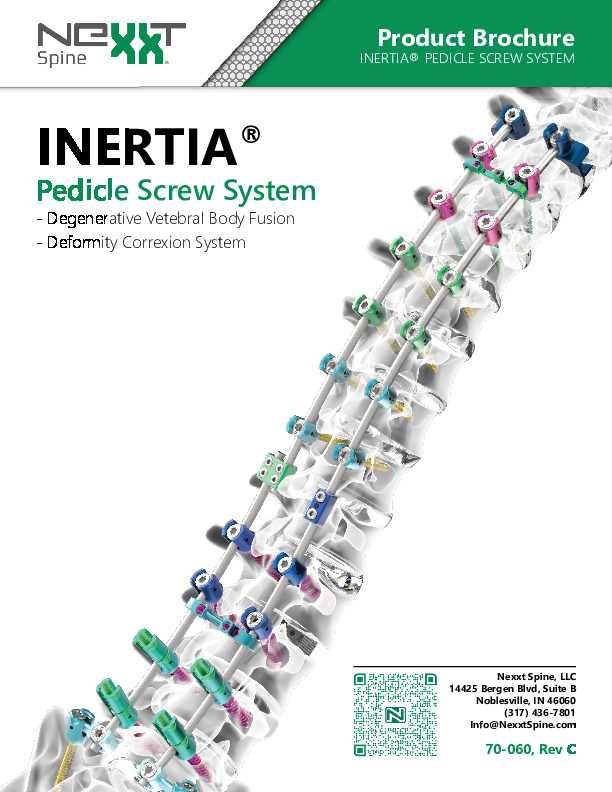 The Inertia Pedicle Screw System by Nexxt Spine is a complete thoracic-lumbar-pelvic fixation system for use in the standard open to complex deformity correction procedures. It features a wide array of screw options including reduction scres, iliac bolts, monoaxial screws, uniplanar screws and portico-cancellous screws. Features a click-in rod feature that clicks and holds rods in place.