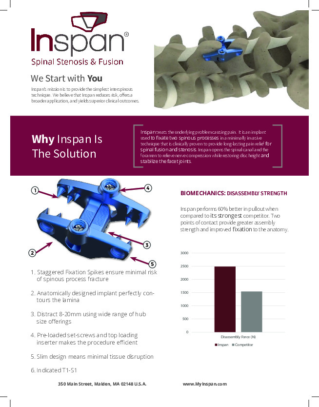 The Inspan Spinous Process Plate System by NANISX (Company of KIC Ventrures) is an interspinous process stabilization clamp composed of titanium with a contour that allows it to fit snugly up against the lamina. It features two interconnected plates that compress together against the spinous process to produce stabilization across the two vertebrae.