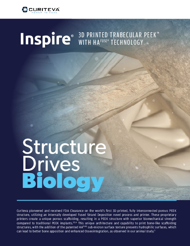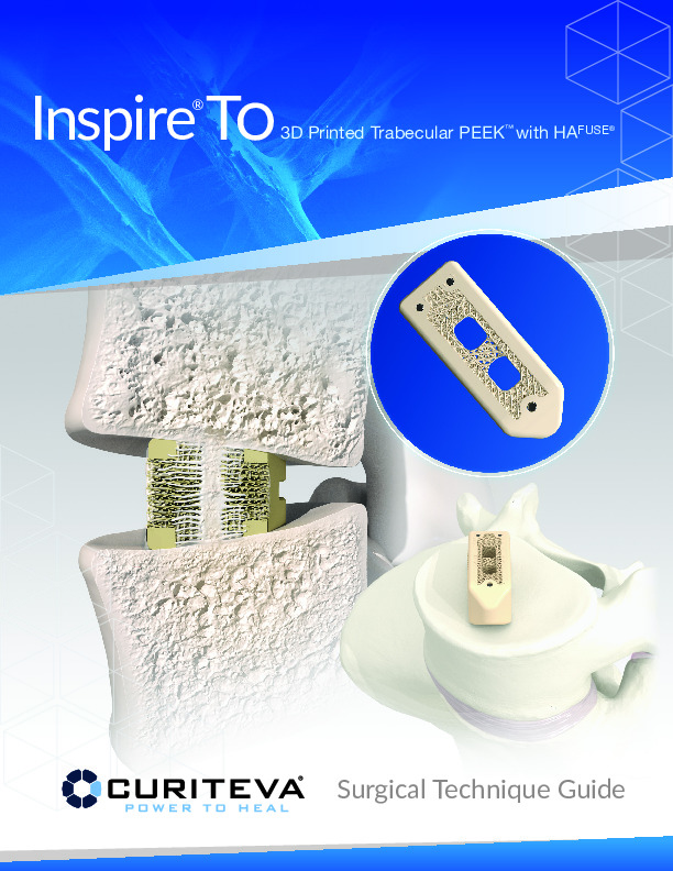 The Inspire TO TLIF Oblique Interbody System by Curiteva is a 3D printed PEEK interbody spacer that it surface treated with HAFuse, a proprietary method that bonds hydroxyapatite to 100% of the implant surface. It is intended for implant in the oblique orientation in the TLIF approach of the lumbar spine.