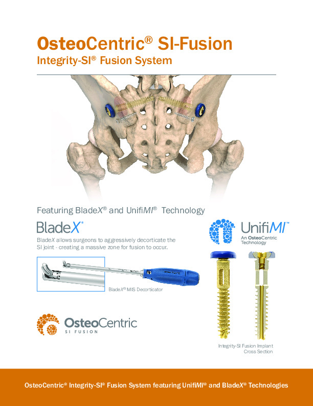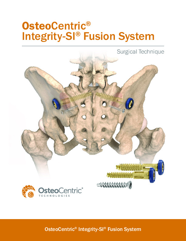 The Integrity-SI Sacro-iliac fusion system by OSteoCentric is a minimally invasive lateral SI joint stabilization. It features an etched titanium lag bolt with a large compression washer to provide compression across the SI joint. The Integrity-SI features a large window that spans the SI joint to facilitate bone graft and bony ingrowth. The surface treatment of the screw allows increased bony purchase for osseointegration. The system feautres a proprietary BladeX instrument that facilitates cleaning out and decortication of the SI joint