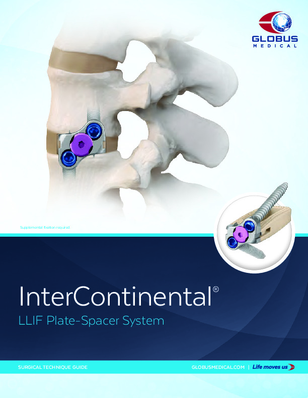 The InterContinental is a lateral Lumbar MIS plate intended to be used with the Intercontinental Spacer also by Globus Medical. The plate can be secured to the cage and fixation is performed with either screws or MIS anchors.