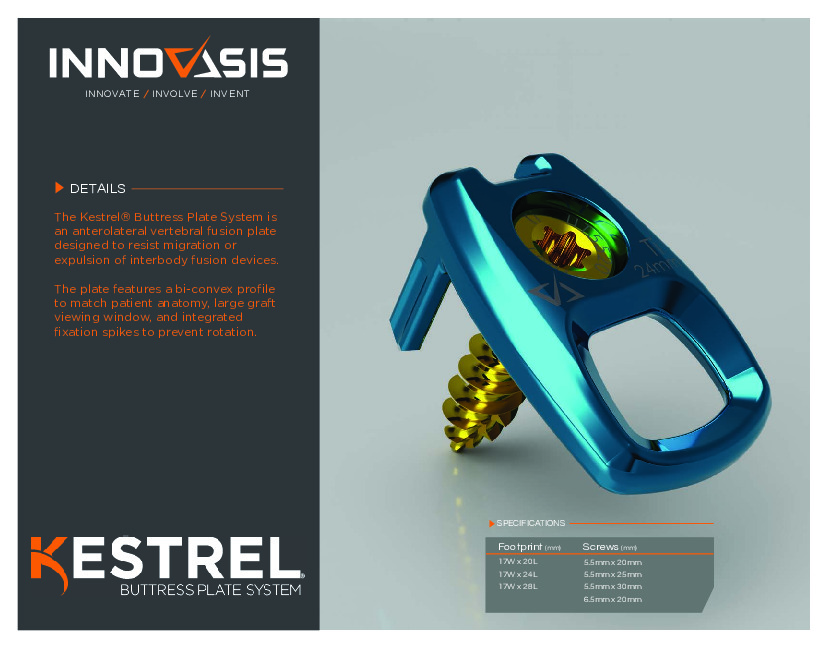 The Kestrel Buttress Plate System by Innovasis is an anterior or lateral plate intended for use in the prevention of interbody migration. The plate is available in 3 size options and screw options of 5.5 and 6.5mm diameters.