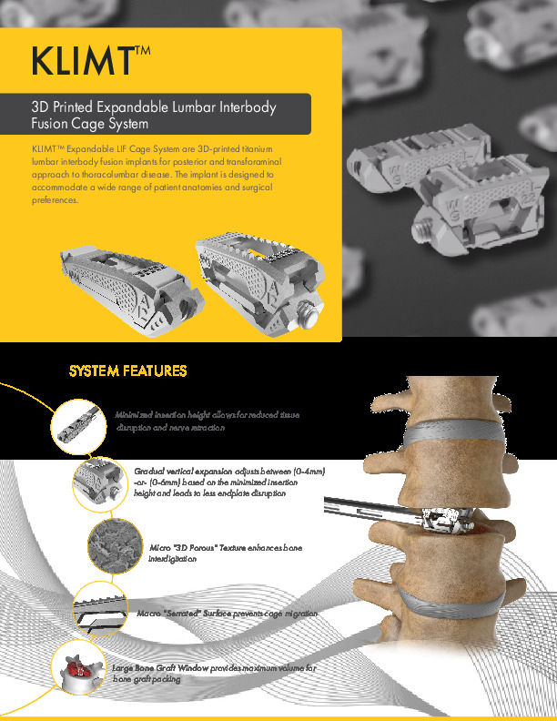 The KLIMT is an Expandable 3D printed Titanium lumbar interbody spacer by CTL Amedica. The KLIMT lumbar interbody Fusion system is intended for use in the oblique TLIF or bilateral PLIF approach. It is intended to expand parallel up to 6mm in height.