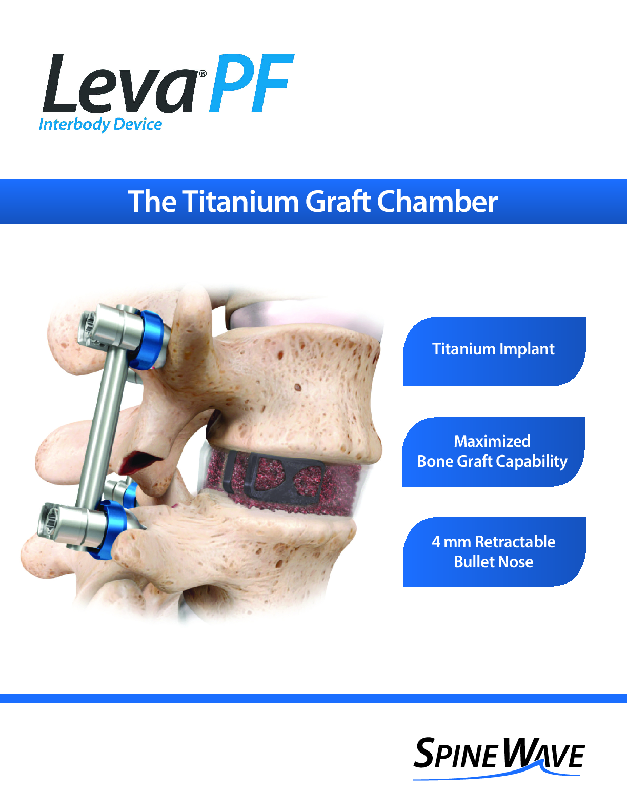 Leva PF by Spine Wave is a fixed titanium interbody implant designed for posterior lumbar approach. It is designed as a structurally strong implant while at the same time providing a unique open architecture for maximum bone grafting capability of the disc space and the cage itself. The inserter has a retractable bullet nose to ease insertion and help protect endplate integrity during placement. It is available in multiple footprint options.