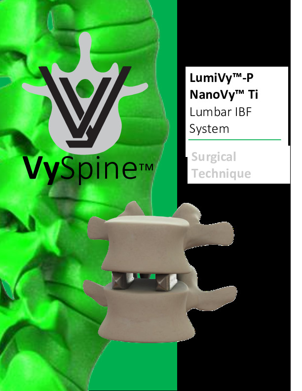 LumiVy-P NanoVy Ti Coated PEEK Lumbar IBF PLIF spacer by VySpine is an interbody fusion device intended for use at one or two contiguous levels in the lumbar spine. It comes in multiple shapes, sizes and angulations, all with anti-migration teeth on the superior and inferior surfaces. The components are made of PEEK-Optima and coated in NanoVy Ti, with embedded radiographic tantalum markers. The NanoVy Ti coating offers increased osseointegration, reduction in fibrous layer, and resistance to delamination.