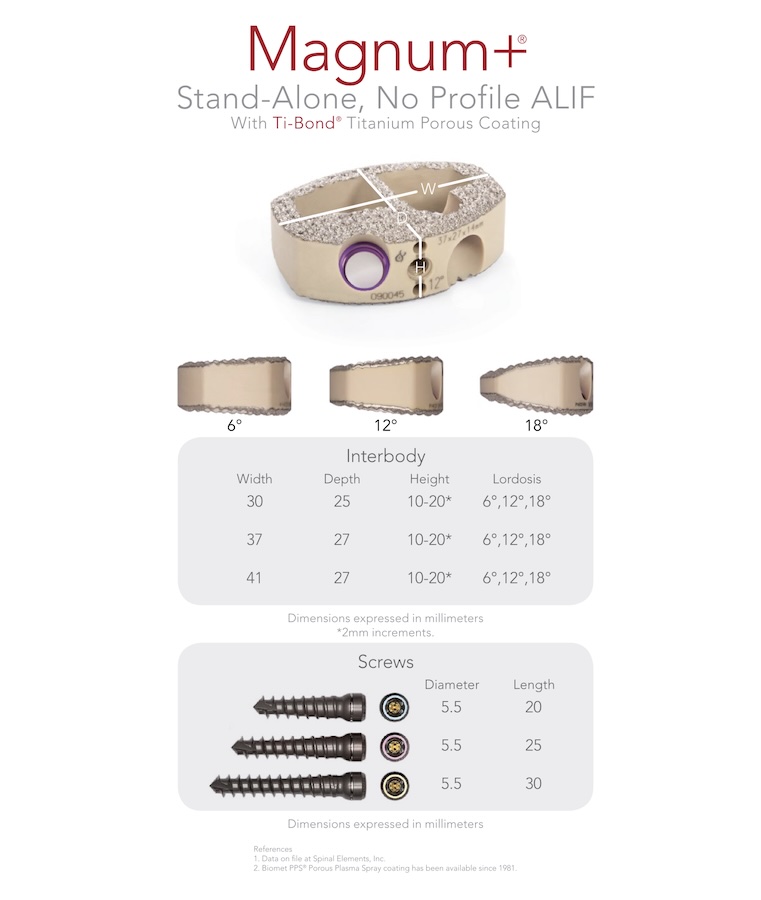 The Magnum+ Stand-Alone ALIF Spacer by Spinal Elements is a titanium coated PEEK interbody spacer using proprietary Ti-Bond surface treatment. Ti-Bond produces increased hydrophilic bonding with increased microstructure for increased surface area and bony adhesion. The spacer has integrated screw fixation with a locking ring to prevent screw backout