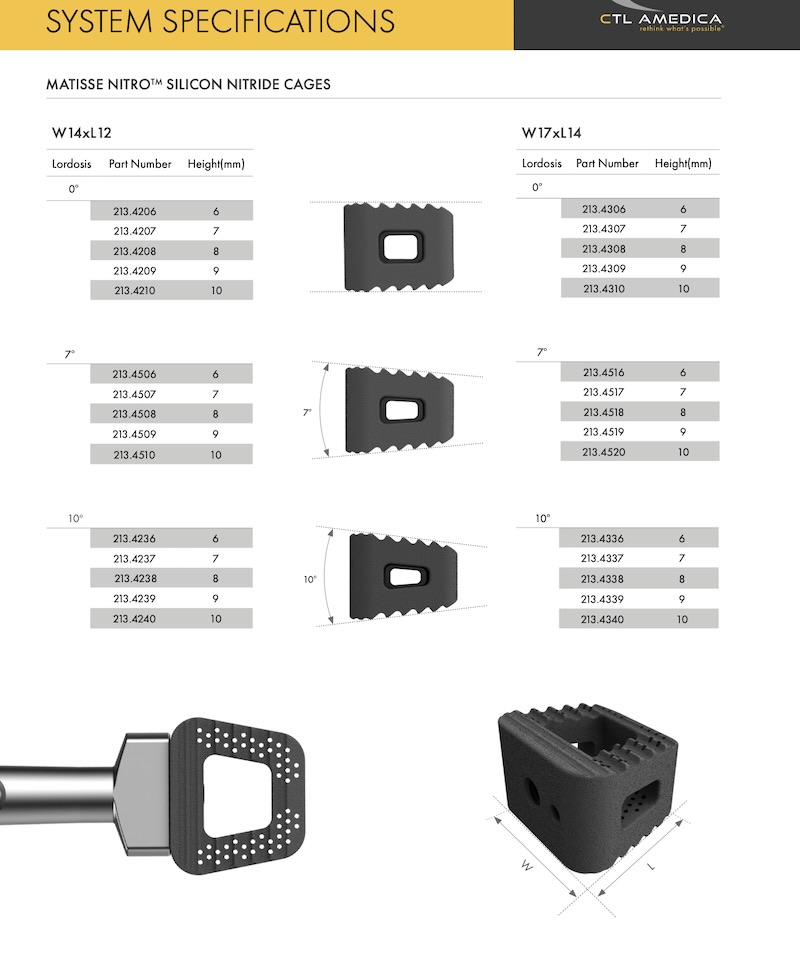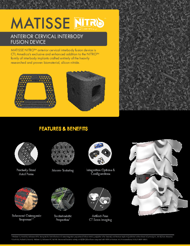 The MATISSE NITRO Anterior cervical Spacer by CTL Amedica is an ACDF spacer composed of silicone nitride in the NITRO family. Silicone nitride is hydrophilic, bacteriostatic, and artifact free.