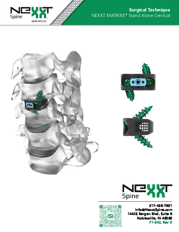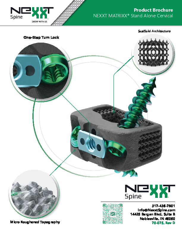 The MATRIXX SA is a 3D printed porous titanium ACDF spacer for use in the anterior cervical fusion procedure. The MATRIXX SA is a true stand-alone spacer with integrated screws that have a single locking cam to prevent screw backout.
