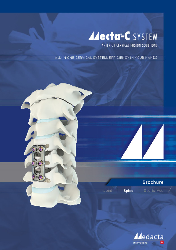 Mecta-C All-In-One ACDF plate and screw system by Medacta. The anterior cervical plate system has both viable angle and fixed locking screws. The screws have an inner locking mechanism to prevent backout. Large anterior graft visualization windows allow for improved post op imaging of the fusion.