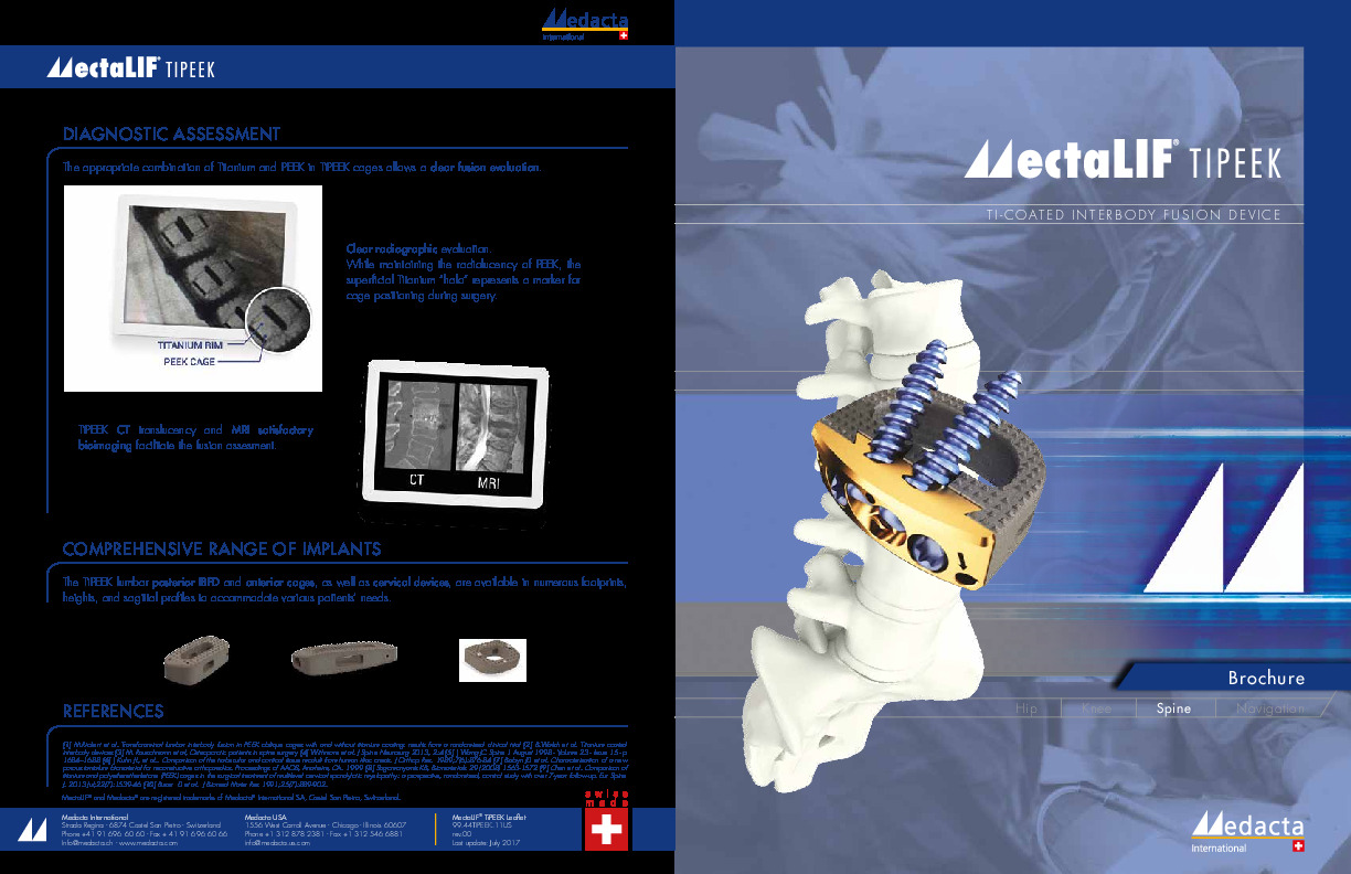 The Mecta-C All-in-One ACDF Anterior cervical discectomy and fusion system by Medacta includes PEEK and titanium coated PEEK options for spacer cages. These come in both flat and domed options with 7 and 5 degree lordosis options respectively.