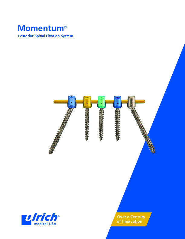 Momentum by Ulrich Medical USA is a comprehensive rod-screw posterior spinal fixation system designed to provide stabilization, fixation, and correction of the thoracolumbar and sacroiliac spine. The system components include polyaxial screws in cannulated/fenestrated, non-cannulated, reduction screws, and iliac screws in open and closed designs, rods, connectors and crosslinks. Can be connected to the neon universal OCT spinal stabilization system using transition rods or connectors.