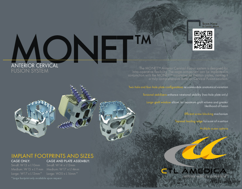 The MONET Anterior Cervical Fusion system is a flexible platform that features multiple options of modular interbody spacers and an integrated fixation using a 2 hole or 4 hole plate.