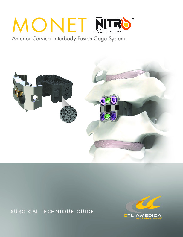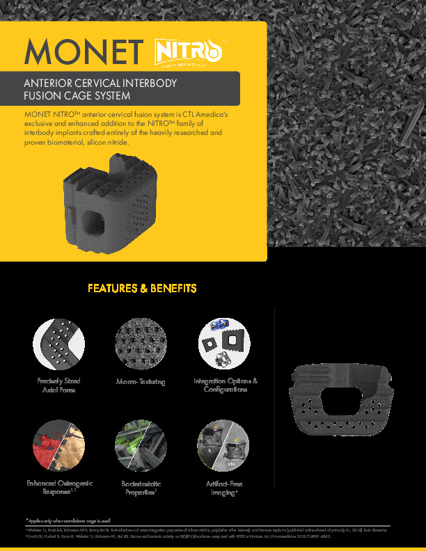 The MONET NITRO by CTL Amedica is part of the NITRO family of Silicone Nitride interbody spacers and is a modular anterior cervical spacer and plate combination for use in the ACDF procedure. The Silicone Nitride spacer assembles to multiple plate options including a zero-profile 2-hole plate and a minimal profile 4-hole plate.