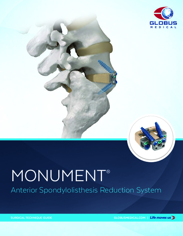The MONUMENT spacer is an anterior lumbar spondylolisthesis reduction spacer with a built-in mechanical reduction feature that, when anchored, allows for the reduction of a grade I or II spondylolisthesis of up to 8mm.
