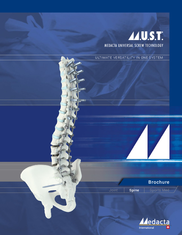 The MUST (Medacta Universal Screw Technology) is comprehensive offering of thoracolumbar stabilization pedicle screw system designed for both degenerative and deformity cases as well as primary and revision. Dual threaded options. Contains full set of rod connectors, side connectors, lateral connectors, hooks, domino connectors. Rod systems in titanium or cobalt chrome and transition rods