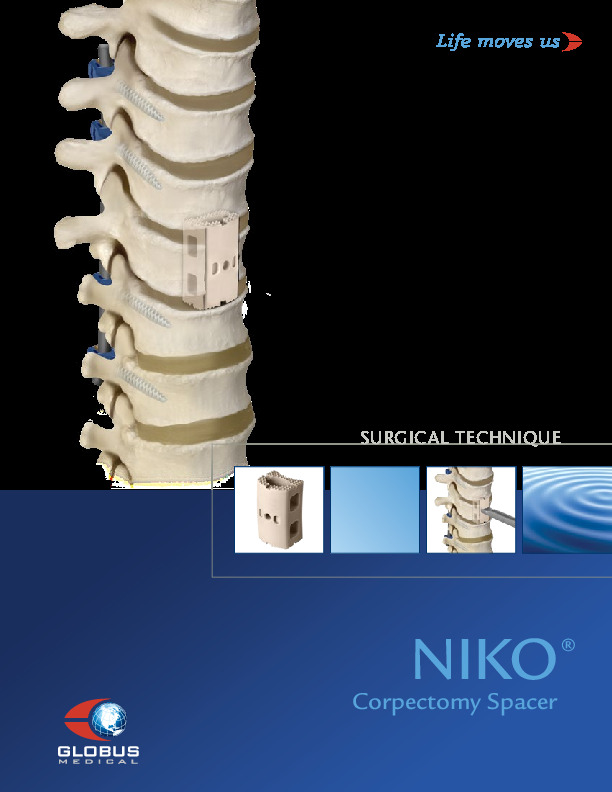 The NIKO Thoracolumbar PEEK Corpectomy spacer is a radiolucent spacer by Globus Medical. The cage is a pre-formed with lordosis and two footprint options. Intended for single level corpectomy and requires supplemental fixation.