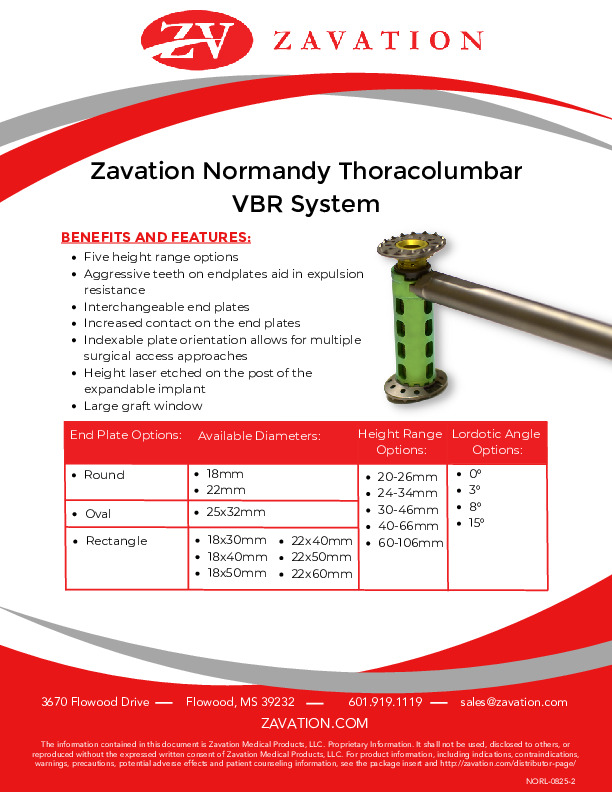 The Normandy Expandable Thoracolumbar Corpectomy VBR System by Zavation is a titanium expandable spacer for use in the anterior of lateral approach to the T1-S1 spine.