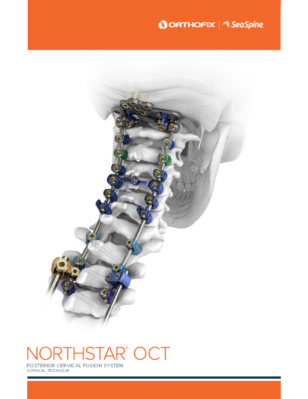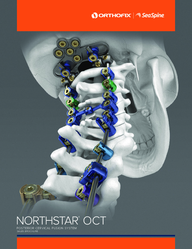 The Northstar Occipital plate is part of the Northstar OCT posterior cervical fusion system by SeaSpine-Orthofix. It features 5 points of fixation to the occiput with up to 15 degrees of angulation of the occipital screws. The lateral tulip heads rotate up to 20 degrees.