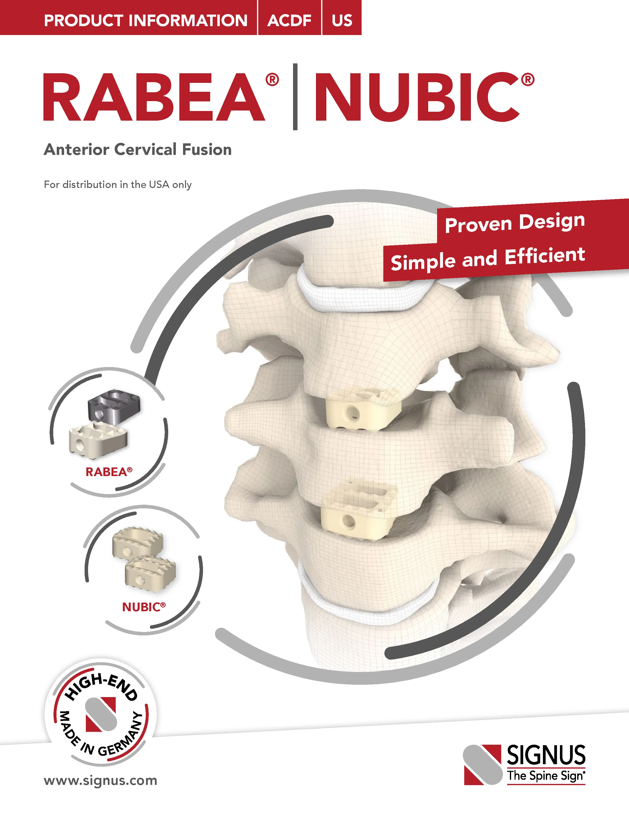 The NUBIC Anterior Cervical Fusion Spacer by Signus USA is a PEEK interbody spacer for use in the ACDF procedure. It features a curved anatomic shaped surface with 4 degrees of built in lordosis.