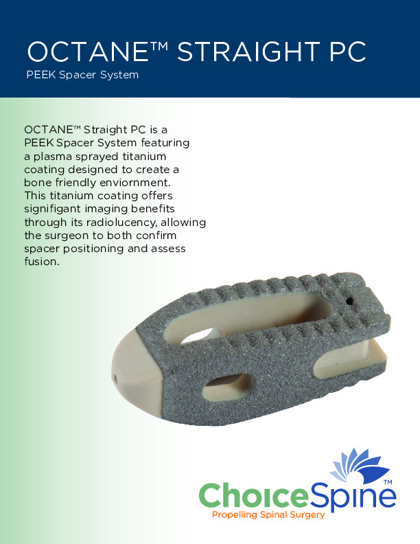 The OCTANE PEEK Straight PC by Choice Spine is a PEEK and Plasma Sprayed titanium coated PEEK straight spacer for use in the oblique TLIF approach or bilateral PLIF approach.