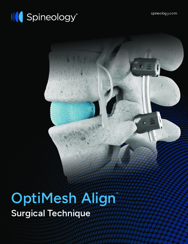OptiMesh Align by Spineology is built on the foundation of OptiMesh, a porous mesh container knitted from polyester yarn made of polyethylene terephthalate (PET) thread. It is a multiplanar expandable interbody implant almost completely comprised of biologics once expanded, and is designed for use in various lumbar interbody fusion approaches including open, MIS TLIF, ultra-MIS (OptiLIF), or endoscopic (OptiLIF Endo). Conform and Expand Technology starts with one of the smallest insertion profiles and dynamically expands and conforms to a patient's unique endplate morphology, generating significant distraction forces to restore disc height. The implant is highly porous with a 1500-micron pore size, allowing for substantial bony through growth. The design allows for continuous expansion with up to 20mm height and up to 29mm width, and the dual-chambered implant provides independent control and expansion of the anterior and posterior components allowing for up to 20 degrees of lordotic shape.