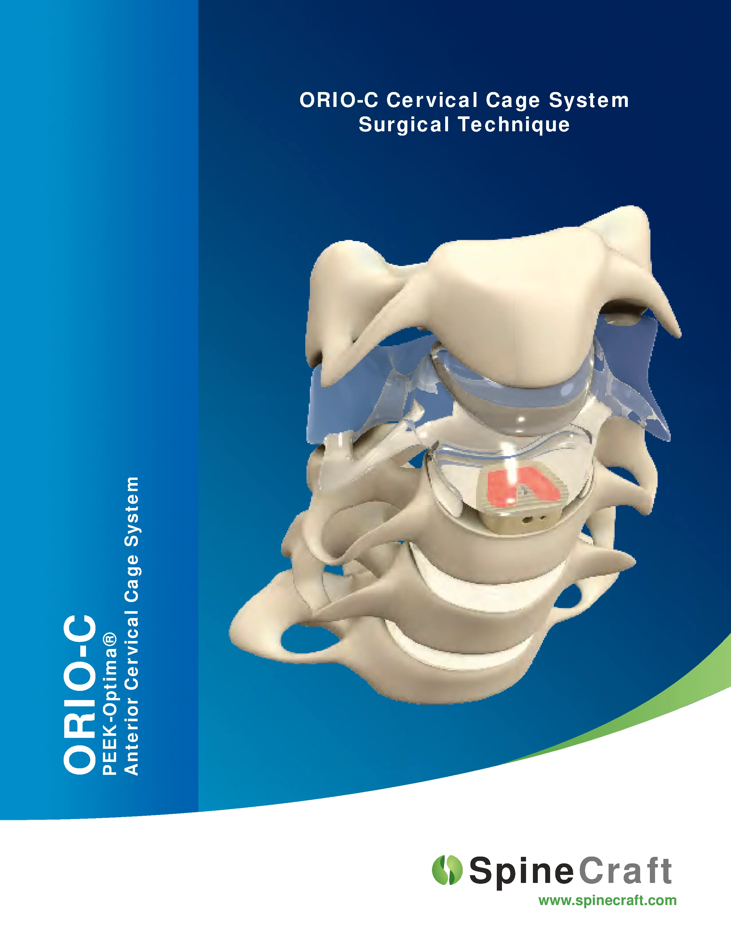 ORIO-C by SpineCraft is an anterior cervical interbody cage made of radiolucent PEEK allowing visualization on Xray and post op imaing. PEEK is also highly biocompatible and offers durability and flexibility similar to those of cancellous and cortical bone. The cranial and caudal surfaces are designed for anatomical fit with stabilizing anchors, and a large graft cavity centrally for filling with bone.