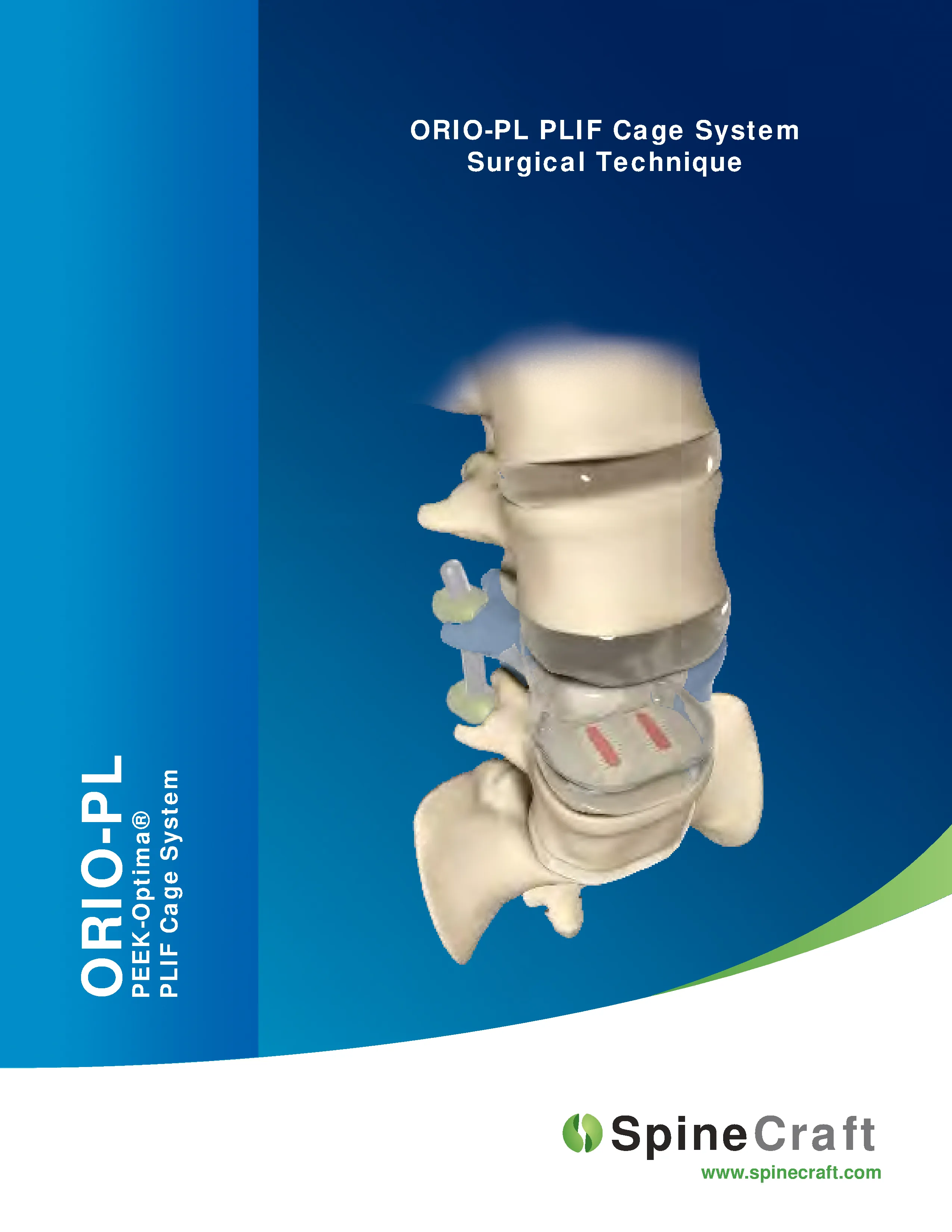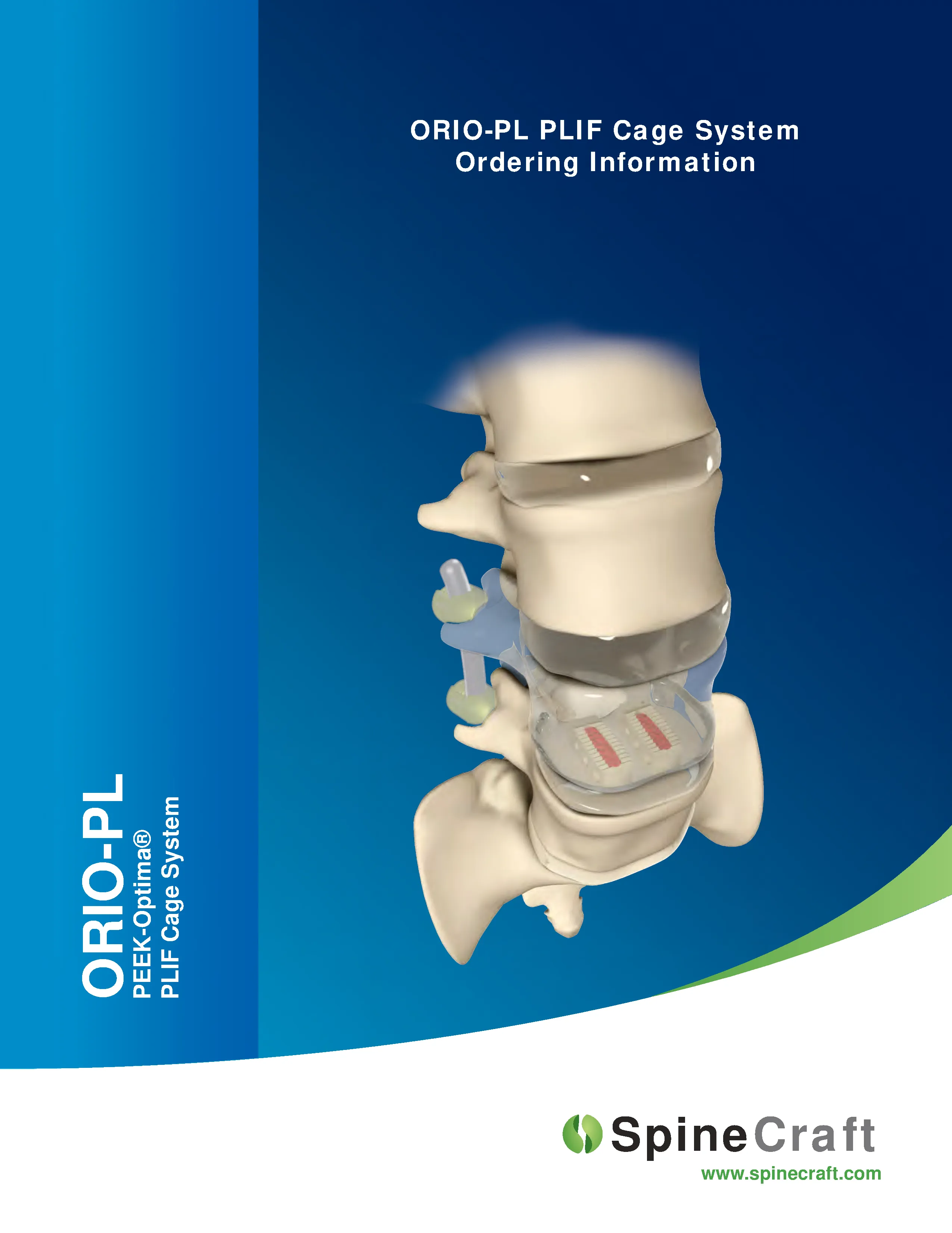 ORIO-PL by SpineCraft is a posterior lumbar interbody cage made of solid PEEK. Anterior and posterior tantalum markers are incorporated for radiographic visualization. The implant has a bullet-nosed design for ease of insertion, as well as a large graft cavity to fill with allograft bone.