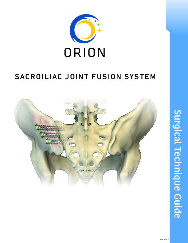 The Orion SI joint system by NeuroStructures/NuGen, is an open implant design which helps improve osseointegration and reduce radiographic signature in SI joint fusion procedures. The screws are cannulated, fully threaded with dual lead and double helix threads, and have distal cutting flutes. Optional washers available to aid in conforming to patient anatomy.