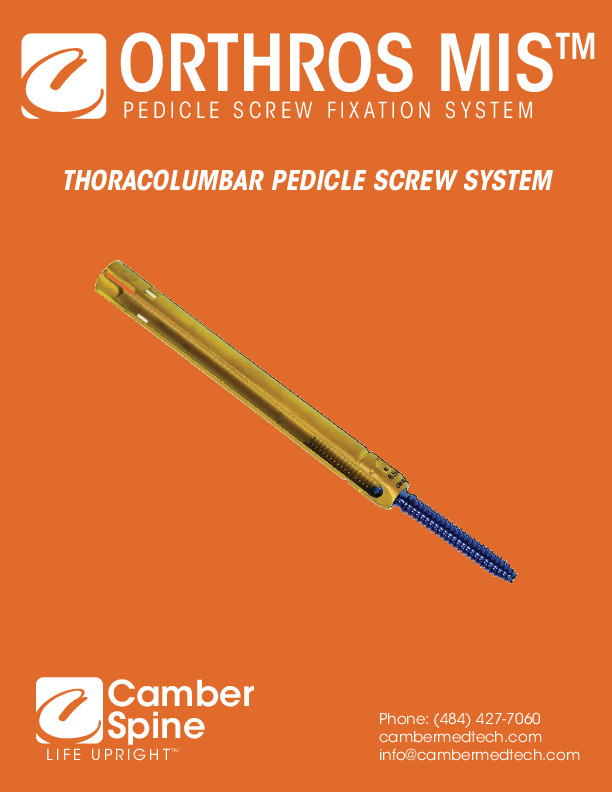 The ORTHROS MIS Percutaneous pedicle screw system by Camber Spine is a minimally invasive system for the thoracic and lumbar spine. The system is designed for a 5.5mm rod system and features a dual-thread pattern with cortical-cancellous threads for increased bone purchase.