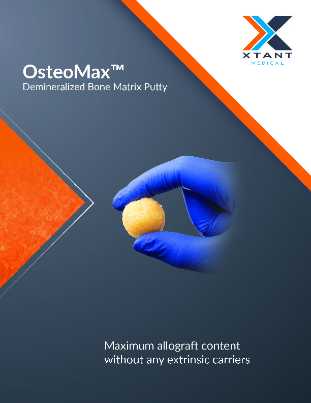 OsteoMax demineralized bone matrix putty by Xtant Medical is a formable DBM allograft that does not contain any extrinsic carriers. The putty is derived entirely from human bone, and contains all five elements of new bone formation (chondrocytes, osteocytes, bone marrow, cartilage, and new bone) which increases is osteoinductive and osteoconductive abilities. It is provided in a ready to use syringe for precise graft placement, and can be stored at room temperature.