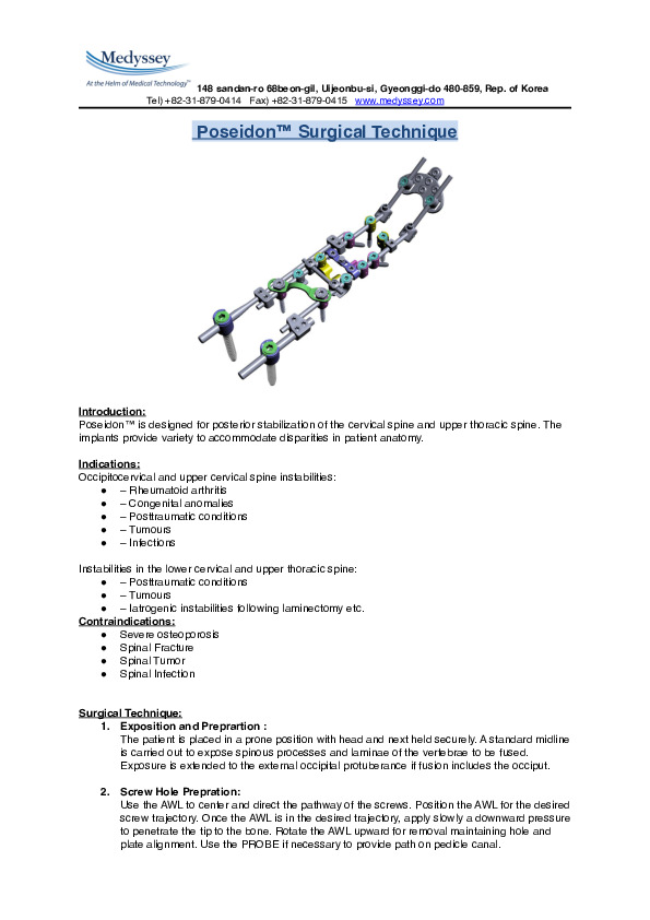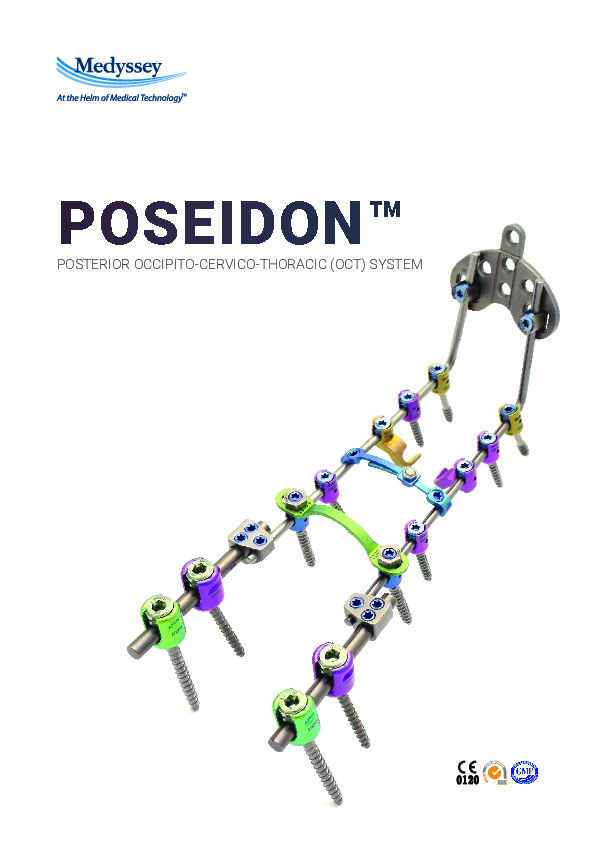 Poseidon by Medyssey is a posterior occipito-cervico-thoracic (OCT) fixation system made of titanium alloy with a wide range of screws, rods, plates, and connectors. The occipital plates are available in multiple size and hole options, rods come both straight and prebent with dual rod options, there are multiple connectors and crosslink options, and pedicle, smooth shank, and lateral mass screws are polyaxial.