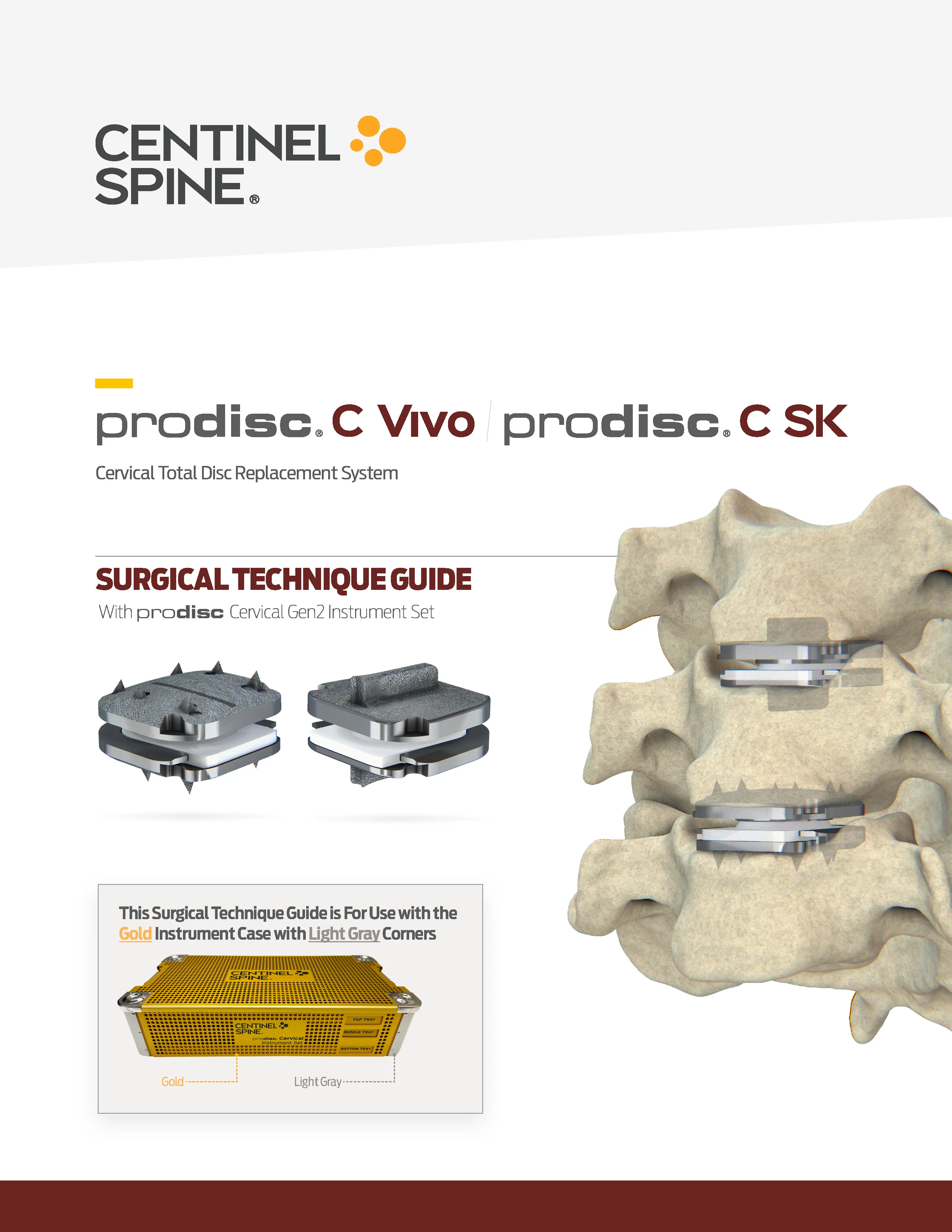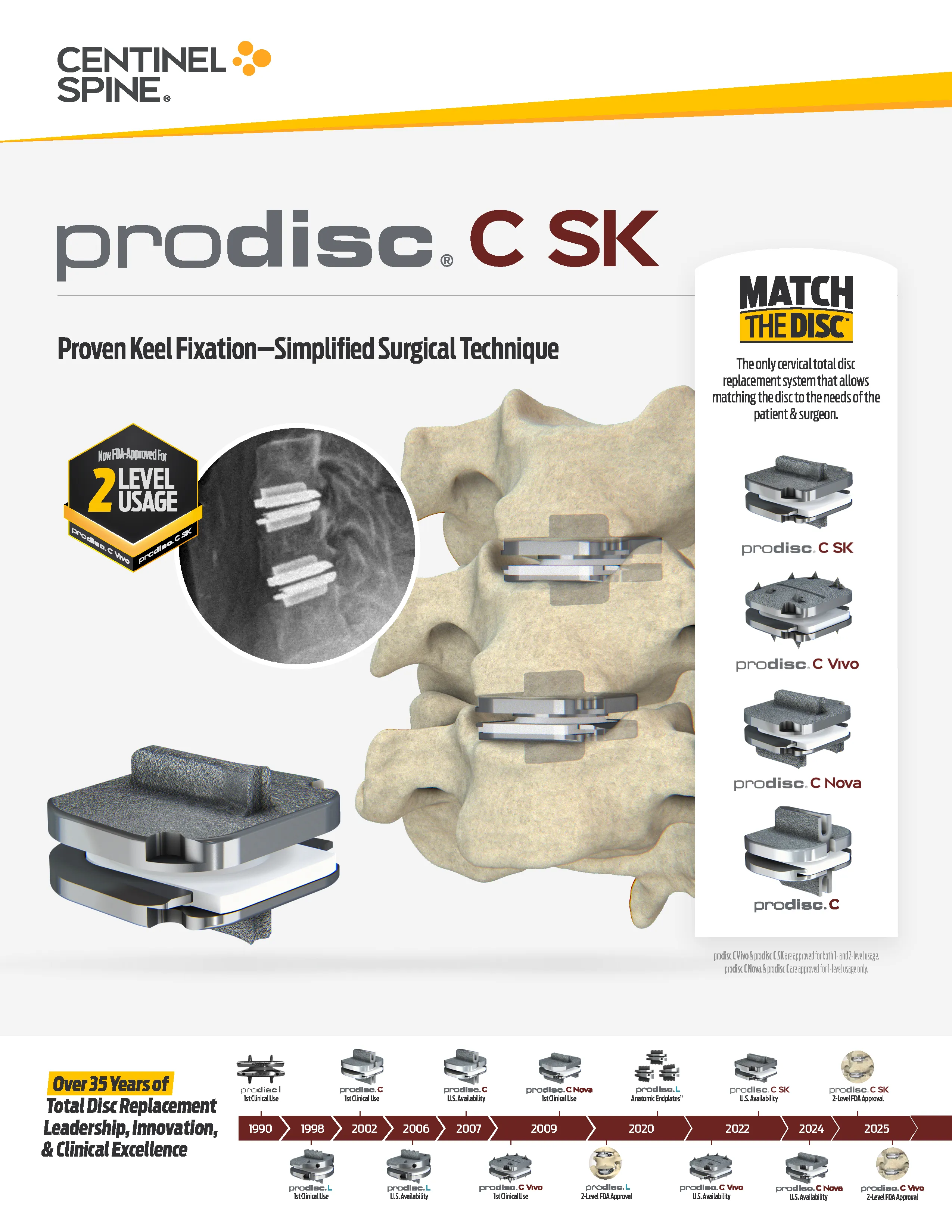 The Prodisc C SK small keel is an artificial disc by Sentinel spine and used in the cervical arthroplasty procedure in single level disc replacement between C3 and C7.The endplates are composed of CoCrMo (Cobalt-28Chrome-6Molybdenum). The inlay is UHMWPE. Prodisc C SK recieved 2 level approval on 10/2025