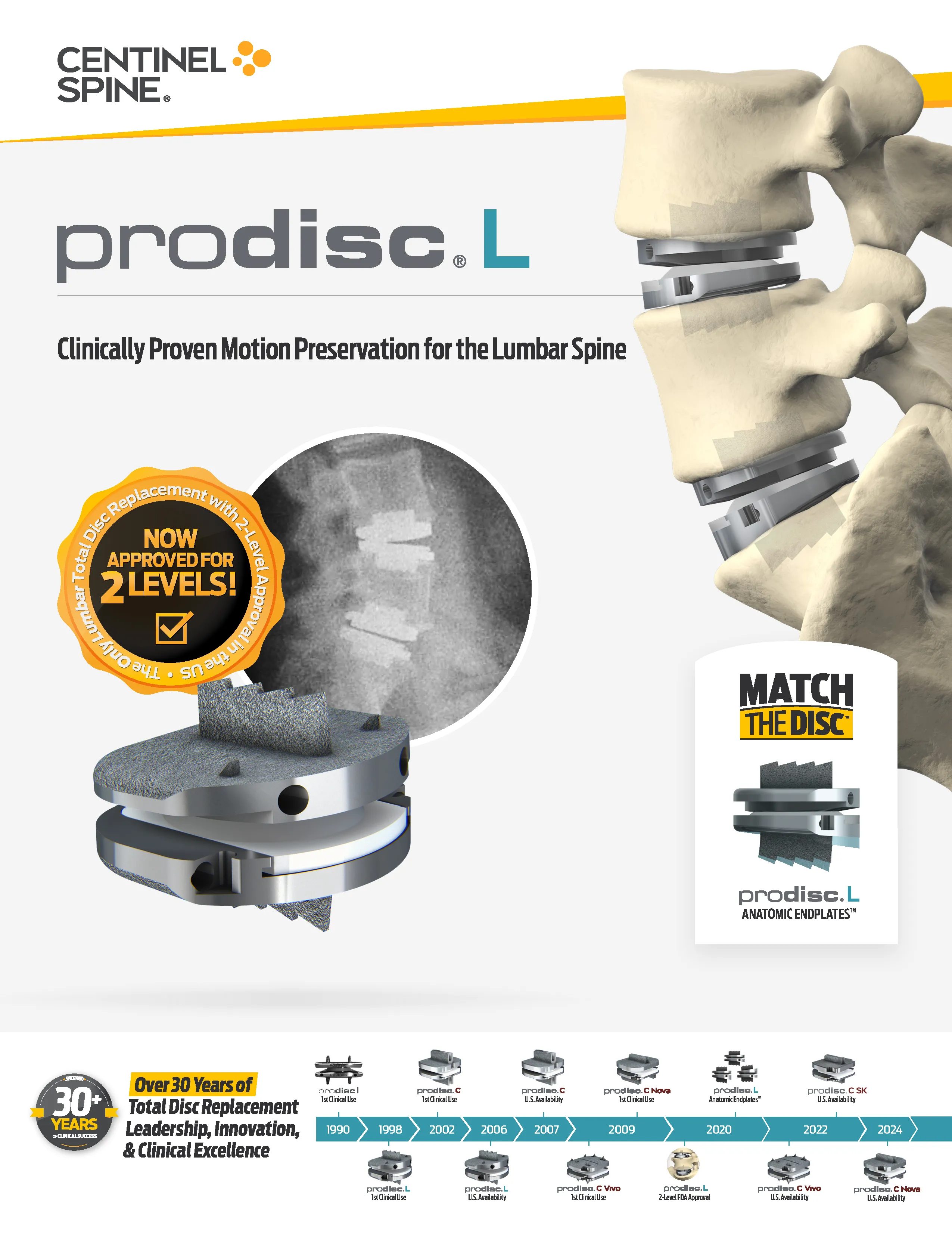 The Prodisc L Lumbar disc arthroplasty by Centinel Spine is an anterior lumbar disc replacement with a central keel. The disc has 12 different anatomical combinations to optimize patient anatomy. The endplates are composed of CoCrMo (Cobalt-28Chrome-6Molybdenum) with plasma sprayed titanium coating. The inlay is UHMWPE (ultra high molecular weight polyethylene.
