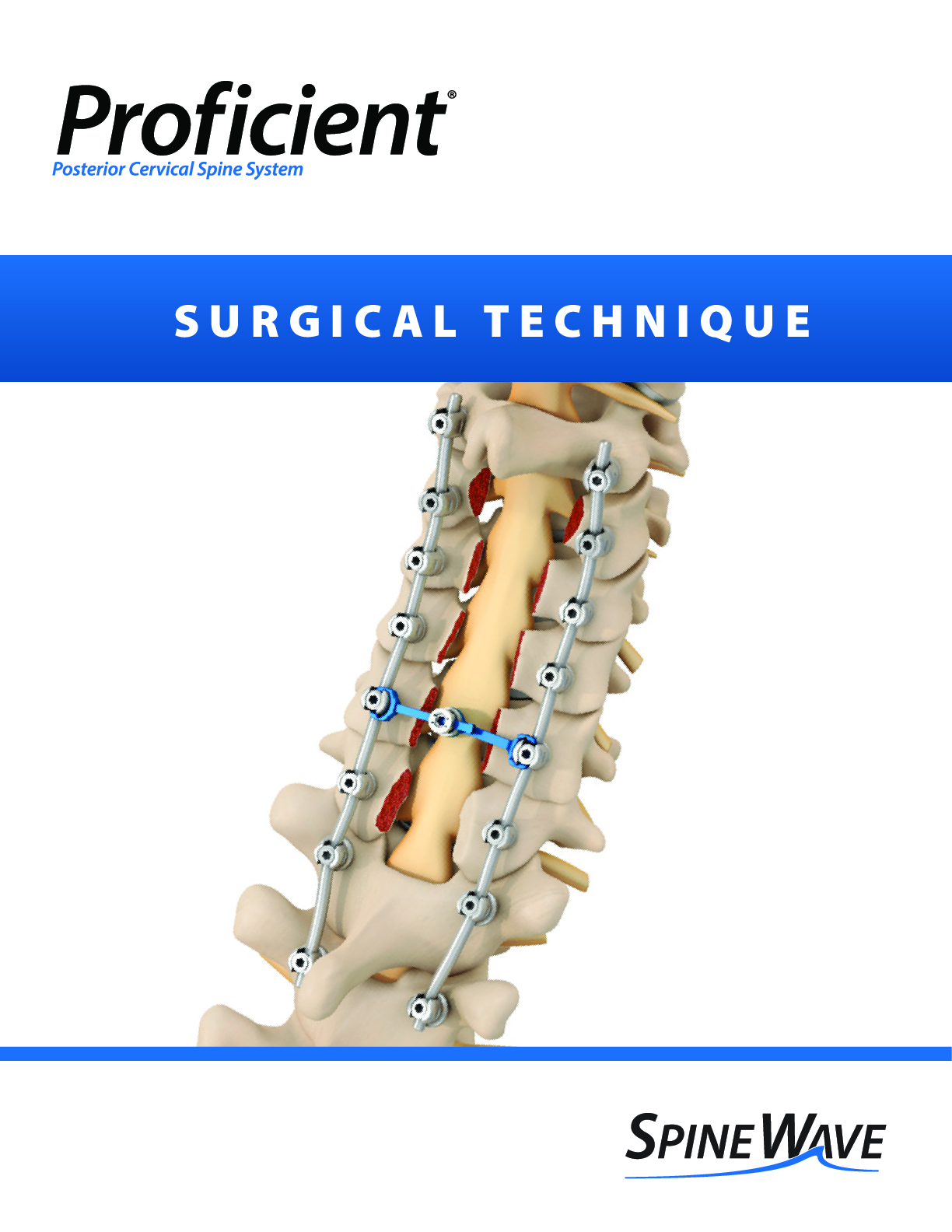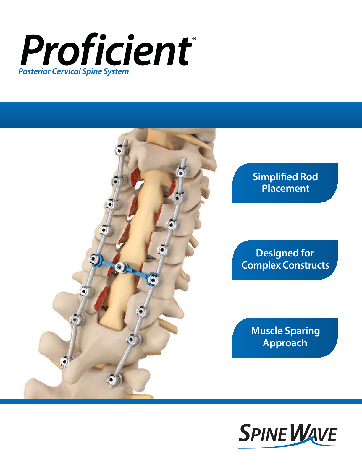 Proficient by Spine Wave is a versatile posterior cervical spine system designed to treat standard or complex posterior cervical spine cases from a traditional open or muscle sparing approach. It offers three unique screw designs: polyaxial tri-lobe screw with 120 degrees of angulation with a freely-functioning tensioned tulip head, a translational screw which offers 80 degrees of angulation and allows for 5mm of medial/lateral translation, and extended tab screws to help guide rod placement with 3mm of reduction. To simplify longer complex constructs, the screws are available in 3.8, 4.2, 4.6, and 5.5 mm diameters and accept 3.5 or 4.0 mm rod sizes, and the system includes smooth shank screws, low profile cross connectors, titanium and cobalt rod options, and various configurations of offset, parallel, and axial connectors.