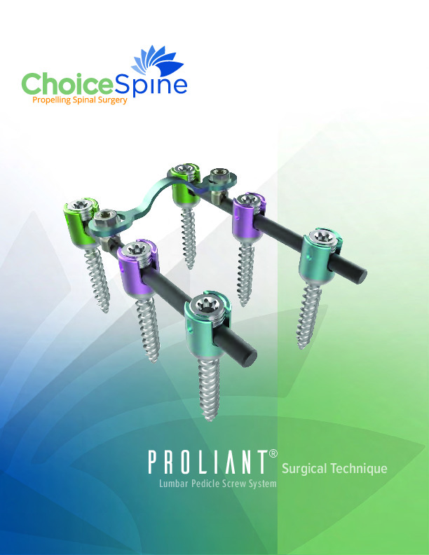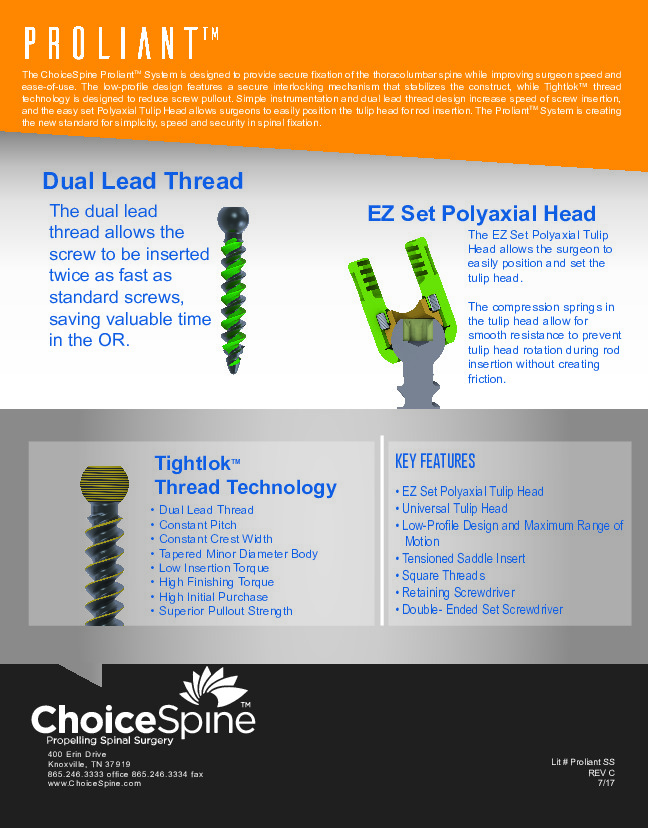 The PROLIANT thoracolumbar pedicle screw system by Choice Spine is an open system for use in the thoracic and lumbar spine and features a dual-thread screw with EZ Set Polyaxial head that allows for stable positioning of the tulip head and retains set position. Available as standard tulip and extended reduction tulip heads. Accepts 5.5mm rod system