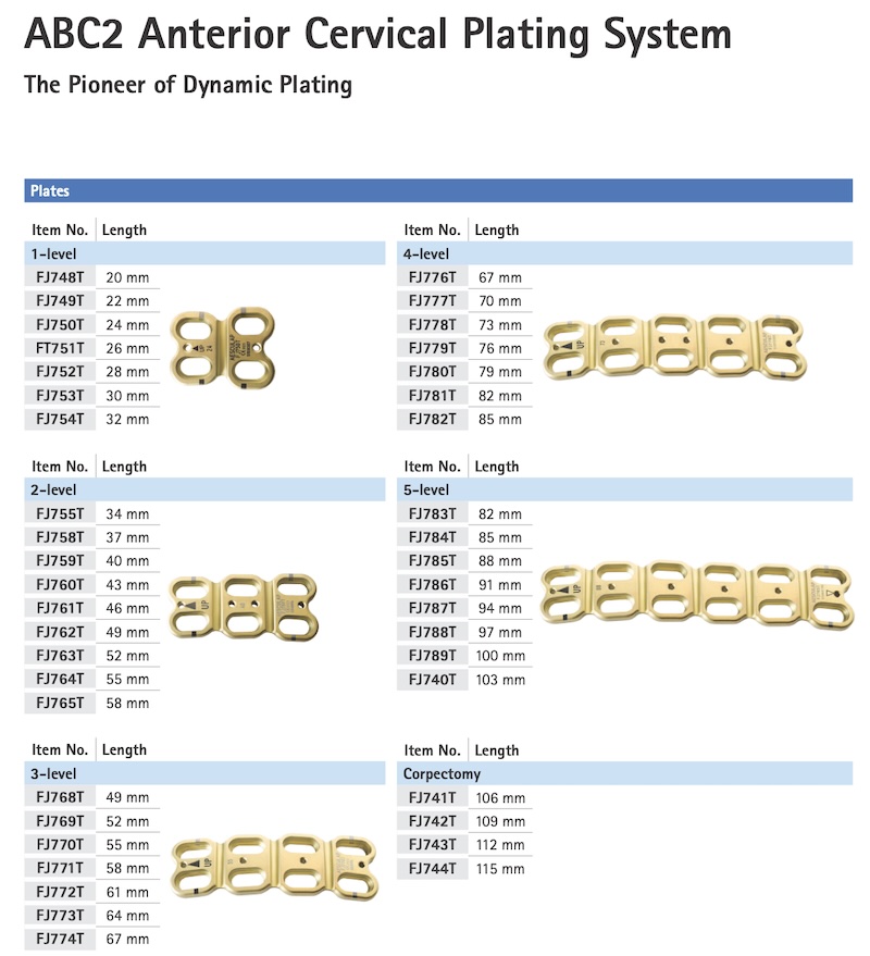The ABC2 Dynamic Anterior Cervical Plate was originally produced by Aesculap. The plate featured locking screws with dynamic slots to allow for some dynamic translation to make use of Wolfs Law. The system also features extension plates to be connected to the original plate for extension procedures.