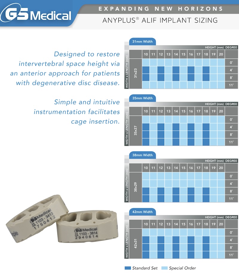 The AnyPlus PEEK ALIF Spacer by GS Medical is a radiolucent PEEK Cage for use in the anterior lumbar interbody fusion procedure. It features serrated teeth to retain the spacer in the disc space and tantalum markers for visualization on imaging.