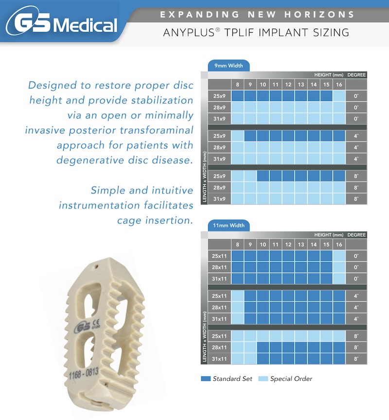 The AnyPlus TPLIF Implant system by GS Medical is a PEEK straight lumbar interbody implant for use in the bilateral PLIF or the oblique TLIF procedure. It features a radiolucent PEEK material with a bullet nose for easy insertion.