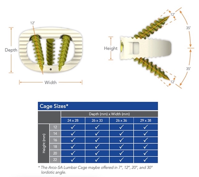 Arco-SA is a standalone zero-profile ALIF implant by NeuroStructures/NuGen that comes in anatomically shaped PEEK or porous titanium. The cage is designed with a large single central graft chamber as well as lateral side windows for additional bone growth in the axial plane, and the porous titanium is excellent at promoting long-term fixation with bone ingrowth. It is available in multiple footprints, lordosis, and heights, with three screw fixation each with variable angulation options and a simple active locking mechanism.