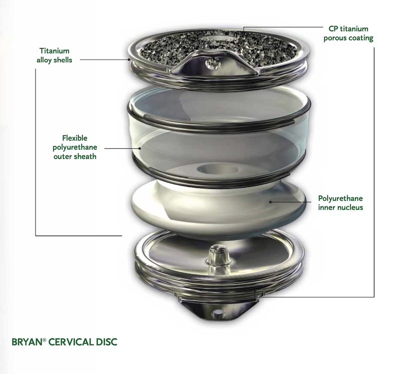 The BRYAN Artificial cervical disc by Medtronic was a disc replacement device that is now retired due to issues with subsidence and heterotopic ossification. The disc is made of two titanium plasma sprayed titanium endplate with a polycarbonate polyurethane nucleus. The core is filled with sterile saline through the endplate plugs prior to implantation. This gives the disc its height which is around 6mm