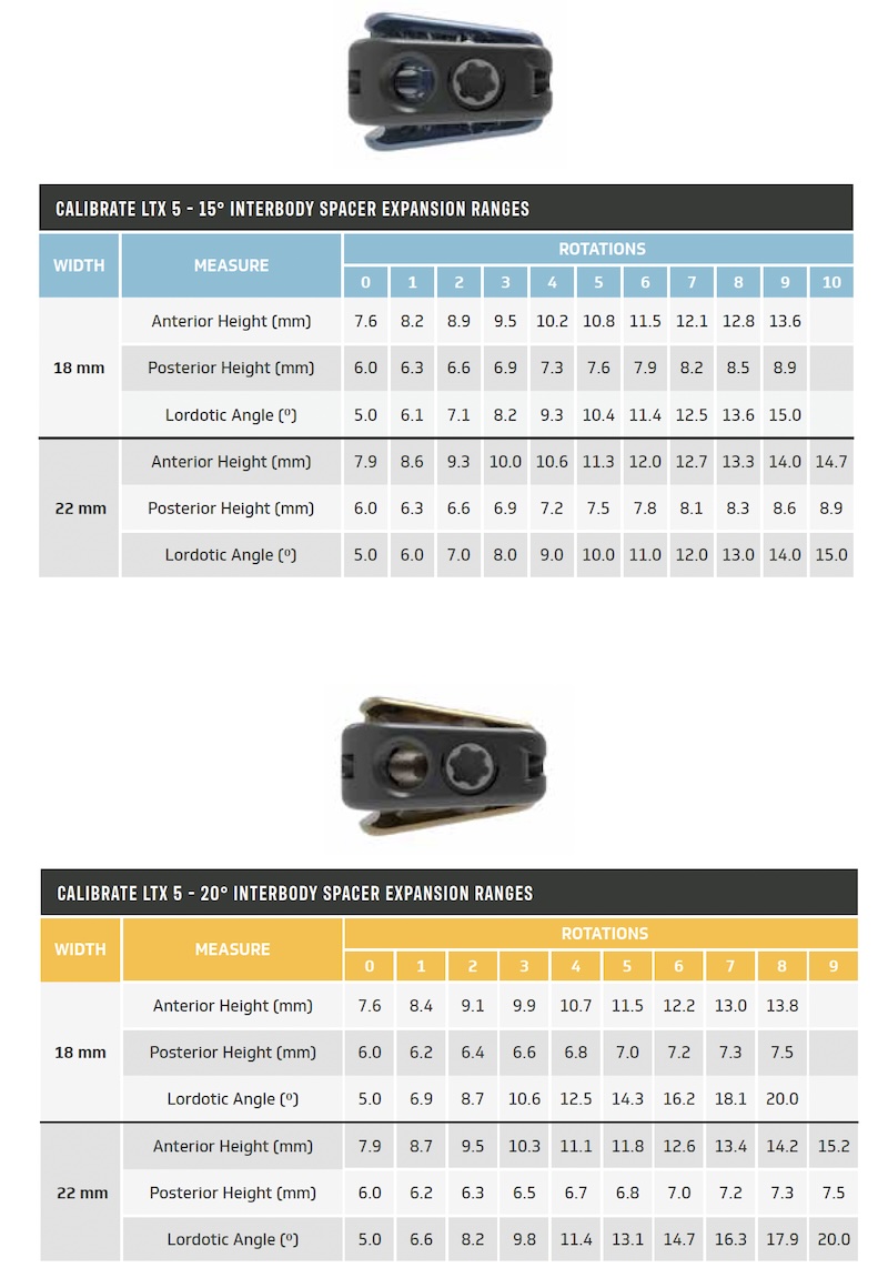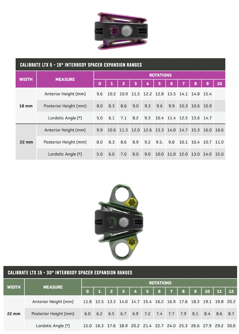 The Calibrate LTX by ATec is an expandable lateral lumbar interbody spacer for use in the LLIF procedure. It features progressive lordotic expansion with multiple lordosis options and width options. NanoTec surface treatment with HA coating provides added grip and increased bony on-growth for faster bony adhesion. Can be used with modular lateral AMP LTX plating system