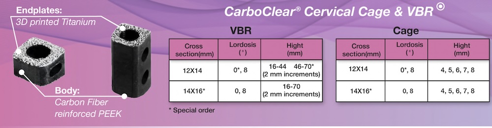 The CarboClear VBR Anterior Cervical Corpectomy Spacer by CarboFix is a carbon fiber reinforced PEEK (CFR-PEEK) spacer for use in the anterior cervical corpectomy procedure and features high strength material with porous 3D printed titanium endplates for increased bony adherence and ingrowth. Optimal for use when future imaging is required such as degenerative, oncology or trauma.