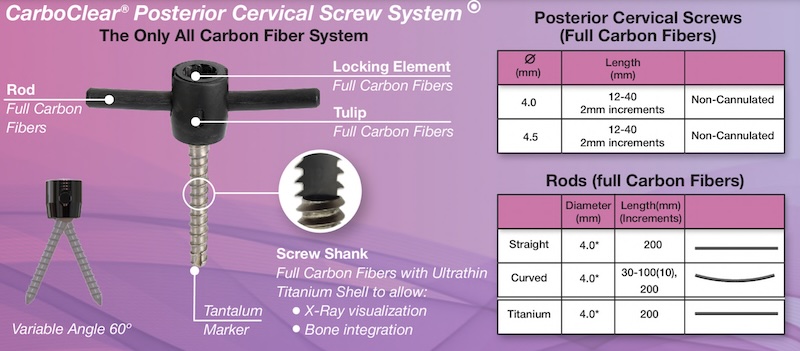 The CarboClear Posterior Cervical Screw System by CarboFix is a carbon fiber reinforced PEEK (CFR-PEEK) screw system with titanium coating. CarboClear posterior Cervical is indicated for use in oncology cases. Screws feature a 60 degree conical angulation.