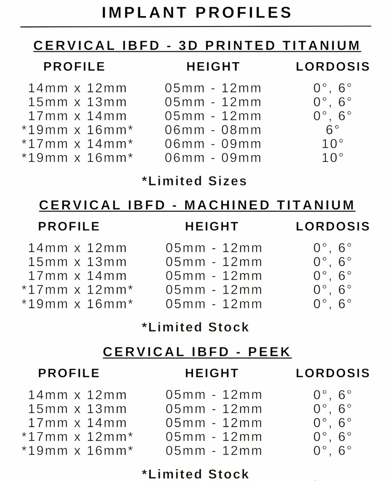 The Cervical IBDF is an ACDF spacer available in 3 different material options. The Cervical Interbody Fusion Device is available in PEEK-Optima, Machined etched Titanium, and 3D printed porous titanium. The spacers have a tapered nose and large central window for graft.