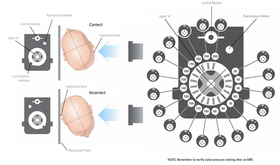The Codman Hakim Programmable valve by Integra Lifesciences is a ball-spring ball-in-cone design valve for the treatment of hydrocephalus. The Codman Hakim ventriculoperitoneal shunt valve features an 18 step pressure options from 30 to 200 mm H2O in 10 mm H2O increments. The valve is adjusted by a magnetic programmer and requires post-adjustment Xray to confirm position. The Codman Hakim valve is not MRI compatible and should be checked after exposure to MRI.