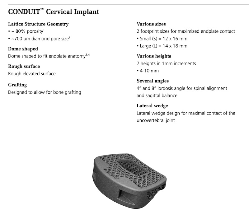 The CONDUIT EIT Cellular ACDF spacer by DePuy-Synthes is a 3D printed titanium with surface roughened microstructure that improves cellular adherence and improved bony ingrowth. The cellular appearance of the lattice structure allow for in-growth of bone for faster fusion.